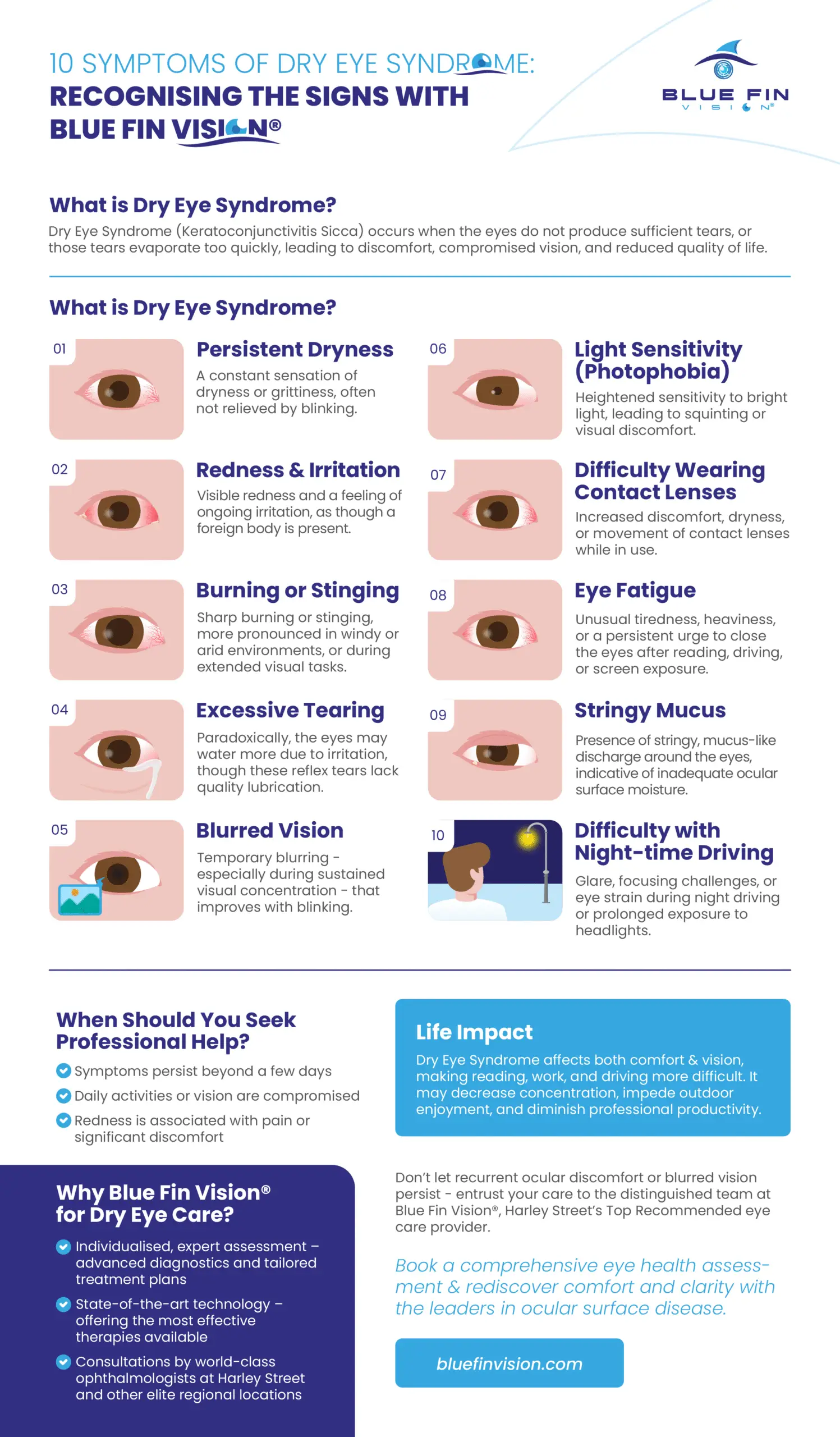 Are your eyes feeling uncomfortable, irritated, or unusually watery? You might be experiencing symptoms of Dry Eye Syndrome, a common condition that affects millions of people worldwide. At Blue Fin Vision® Eye Clinic in London’s prestigious Harley Street, we understand the impact that dry eyes can have on your daily life. In this comprehensive guide, we’ll explore the ten symptoms of Dry Eye Syndrome, also known as Keratoconjunctivitis Sicca, to help you recognise when it’s time to seek professional care.
