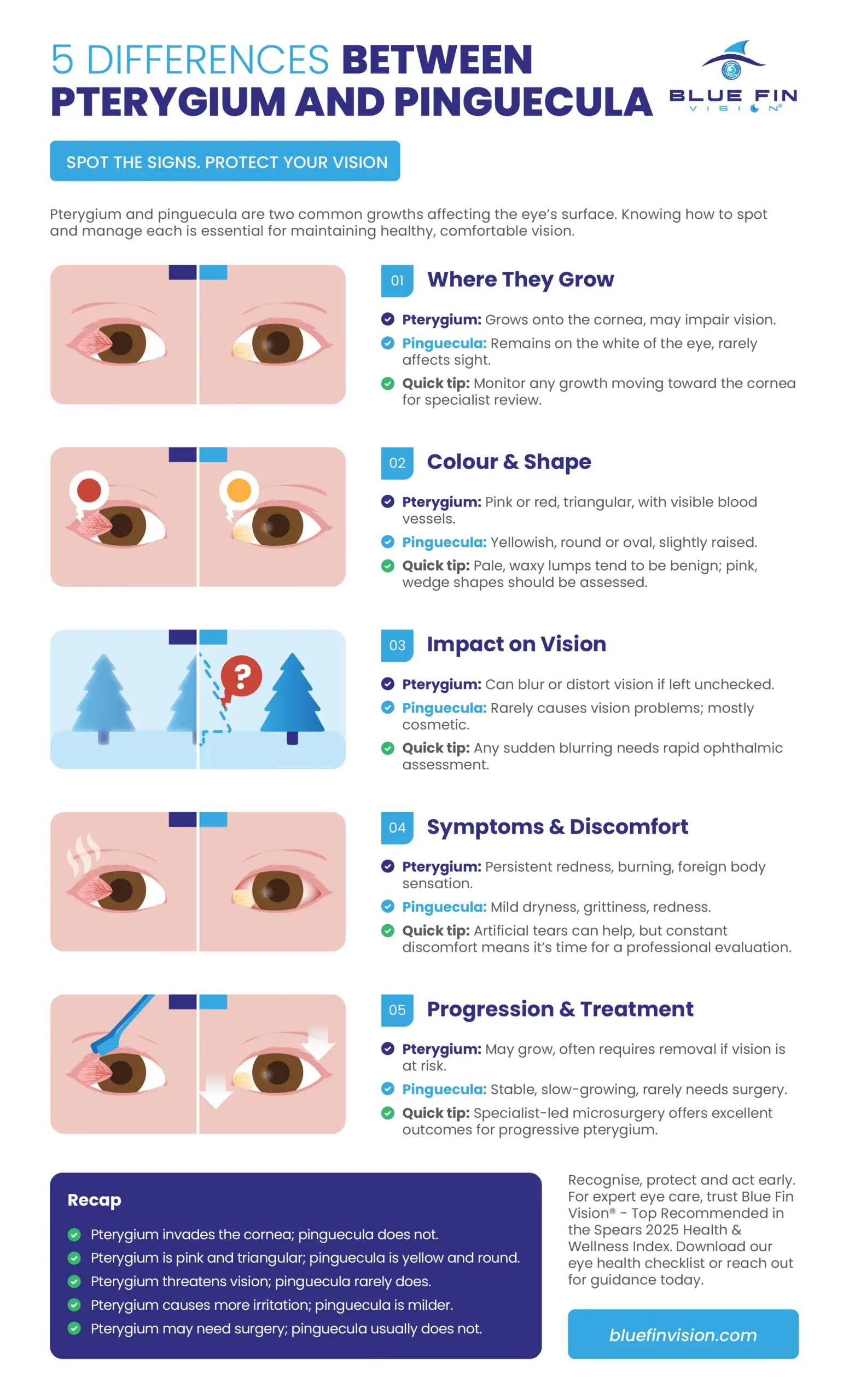 When it comes to peculiar eye growths, the terms “pterygium” and “pinguecula” often cause confusion among patients. Distinguishing between these two conditions is vital for eye health, comfort, and peace of mind. At Blue Fin Vision® Eye Clinic, our specialists help patients spot the distinctions and choose the right course of action, supported by our Top Recommended status in the Spears 2025 Health & Wellness Index. If a mysterious blemish has appeared on the white of the eye, knowing the contrast between these common conditions can make all the difference.