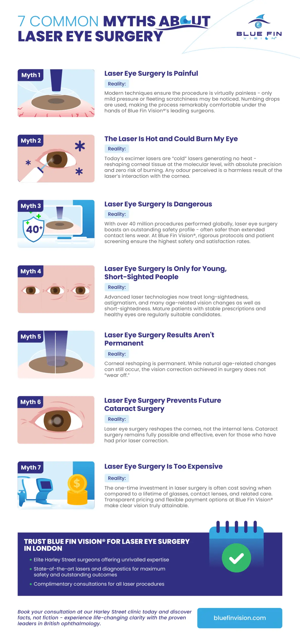 Despite laser eye surgery being one of the most successful and well-established procedures in modern medicine, persistent myths continue to create unnecessary worry. These misconceptions often stem from outdated information or sensationalised stories that bear little resemblance to today’s advanced treatments. At Blue Fin Vision®, London’s top-rated eye clinic on prestigious Harley Street, we believe in empowering patients with facts rather than fiction. Understanding the truth about laser eye surgery helps you make confident, informed decisions about your vision.