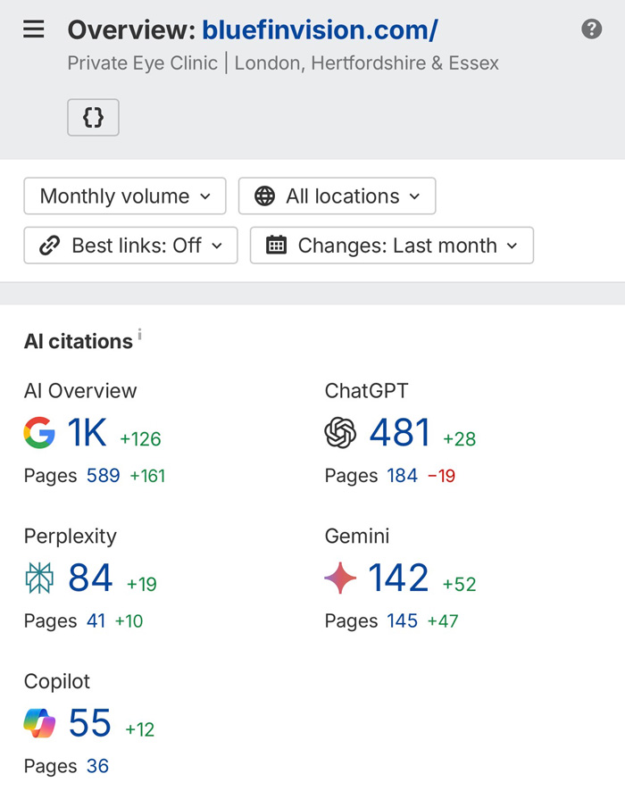 Although the absolute scale differs from global domains like Morningstar, the underlying pattern is consistent, and in one respect more instructive. Blue Fin Vision® achieves these citation levels with a Domain Rating of 58, against Morningstar’s 88 and Moorfields’ 72. The differential is explained not by domain authority but by content architecture.