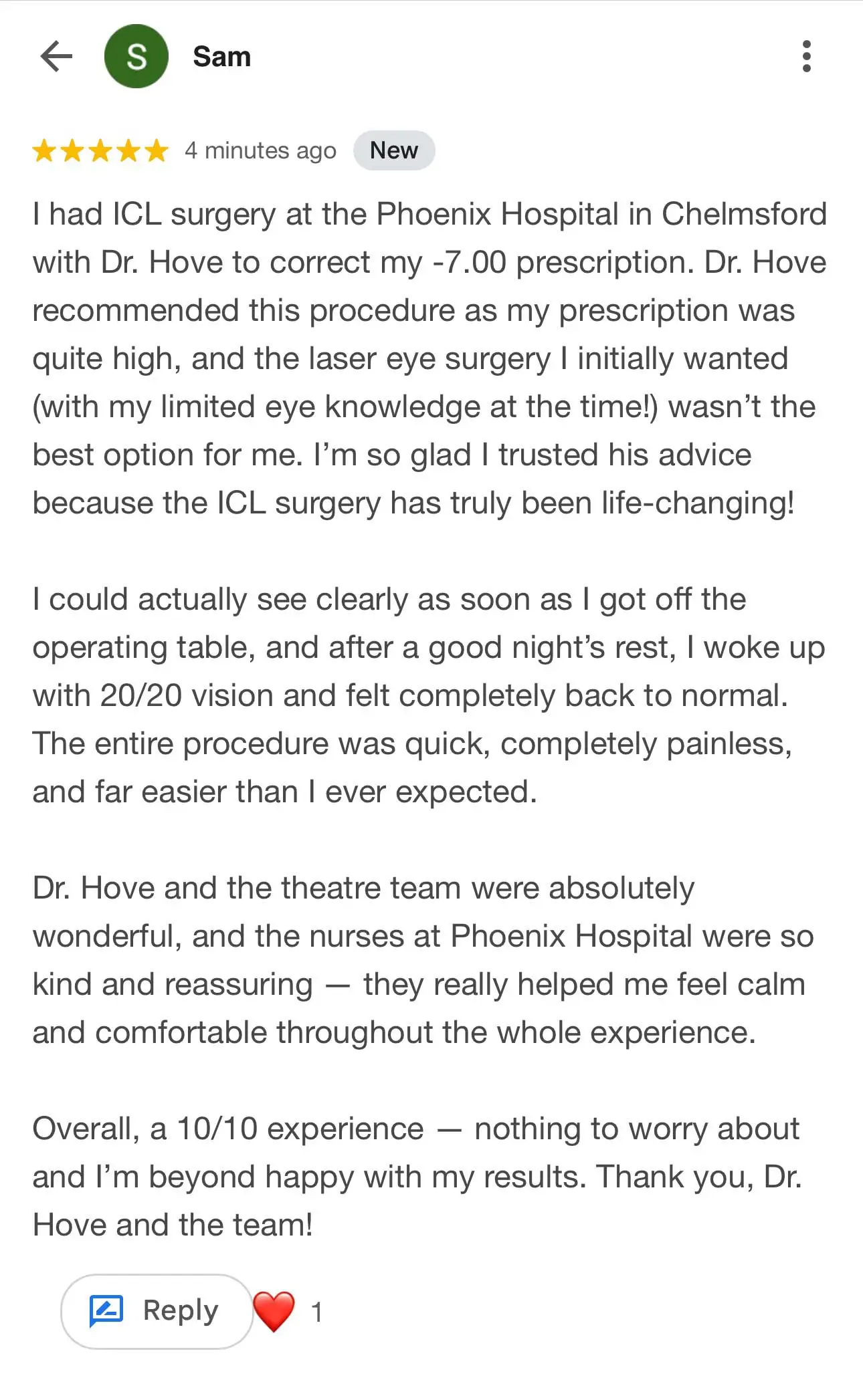 Sam underwent her ICL implantation at The Phoenix Hospital, Chelmsford, where the same consultant-led surgical standards applied as at our Harley Street theatres.