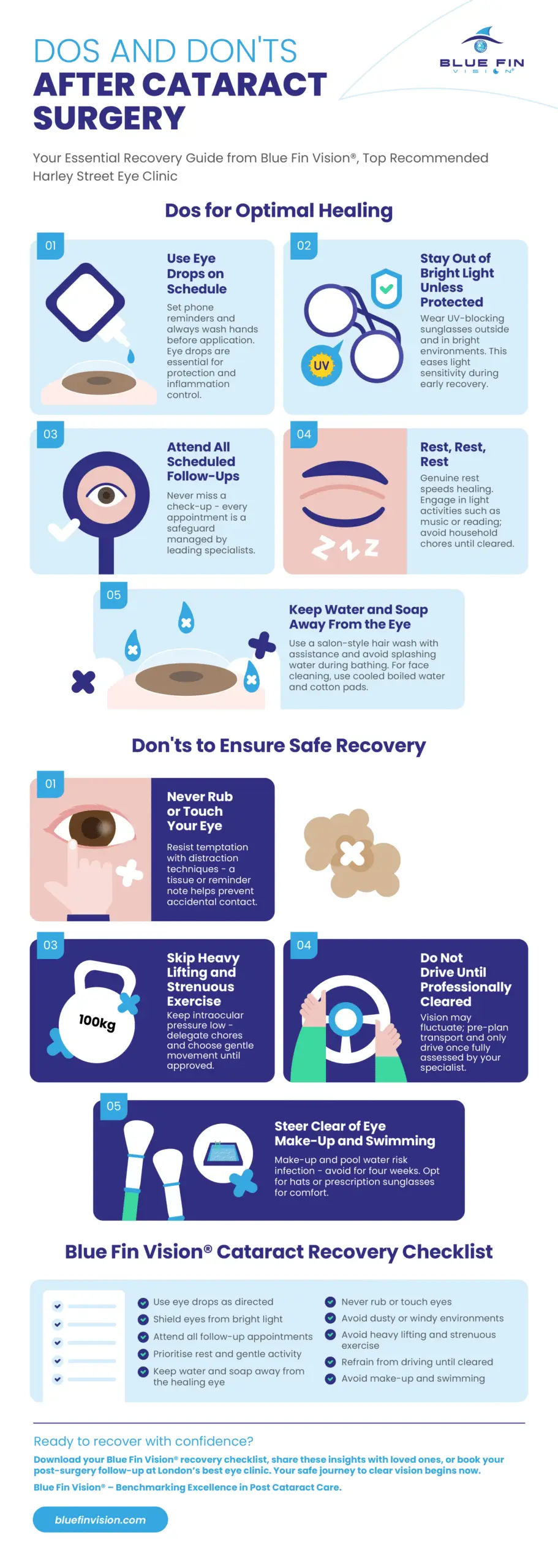 Which tip will you start with today? Download your Blue Fin Vision® cataract surgery recovery checklist, share these insights with loved ones, or book your post-surgery follow-up at London’s best eye clinic. Your safe journey to clear vision begins now.