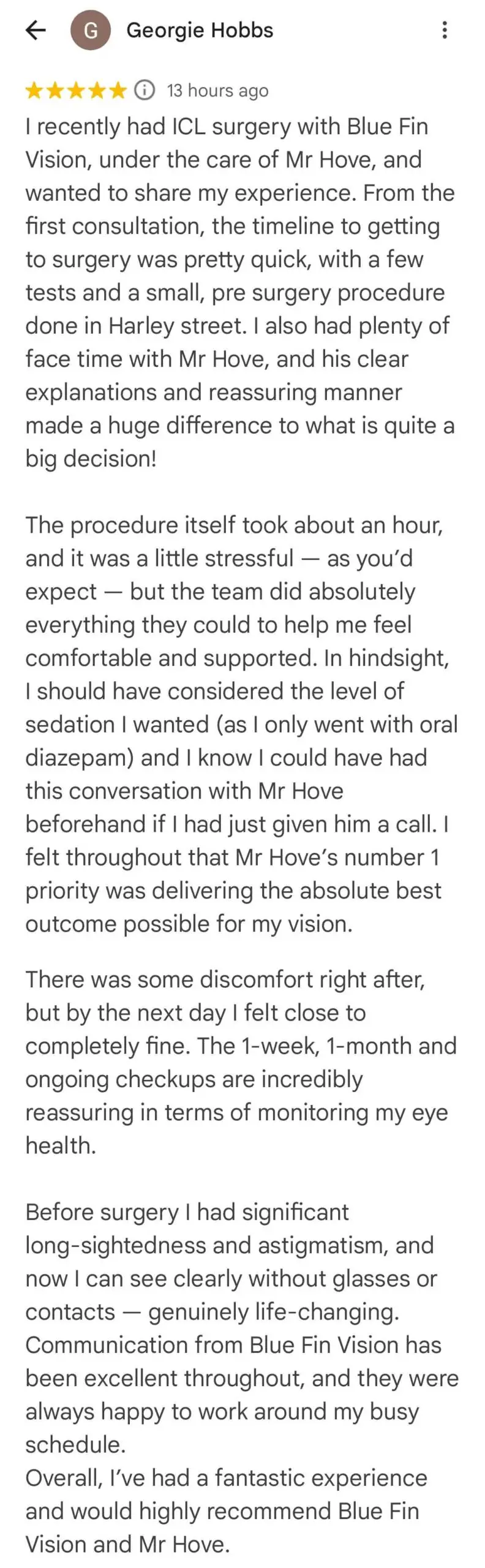 A recent review from one of our patients provides a detailed, honest, and powerful insight into what this journey feels like from the patient perspective. It is one of the most comprehensive ICL testimonials we have received, capturing not just the surgical outcome, but the full emotional experience from anxiety to clarity.