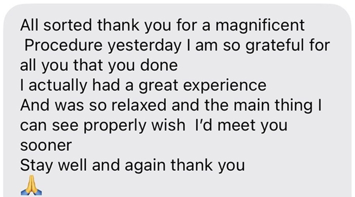 One patient recently referred by her optician described how reassurance during the consultation and on the day of surgery helped ease her initial nerves. Within 24 hours of surgery, she was already experiencing clear vision without glasses.