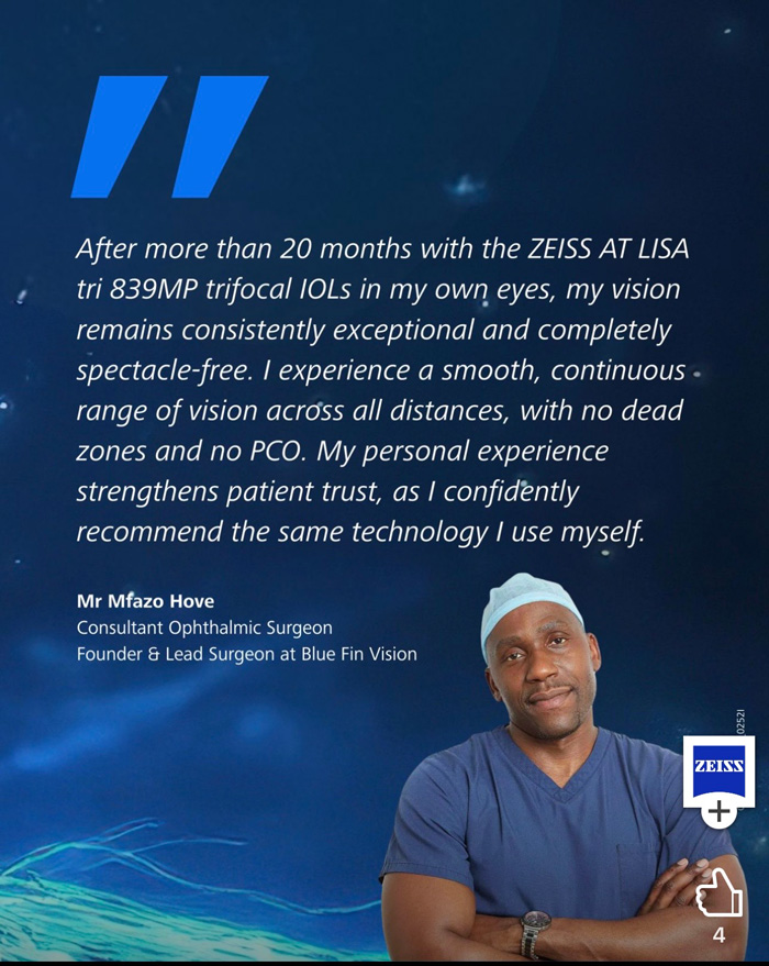 Mr Mfazo Hove is a Consultant Ophthalmic Surgeon with experience spanning more than 57,000 procedures. He completed 6.5 years of specialist training at Moorfields Eye Hospital and served for five years as a consultant at the Western Eye Hospital, Imperial College Healthcare NHS Trust. He is the founder of Blue Fin Vision®, a consultant-led private ophthalmology practice operating across London, Essex, and Hertfordshire. His clinical expertise encompasses advanced cataract surgery, refractive lens replacement, laser vision correction, and implantable Collamer lenses (ICL).