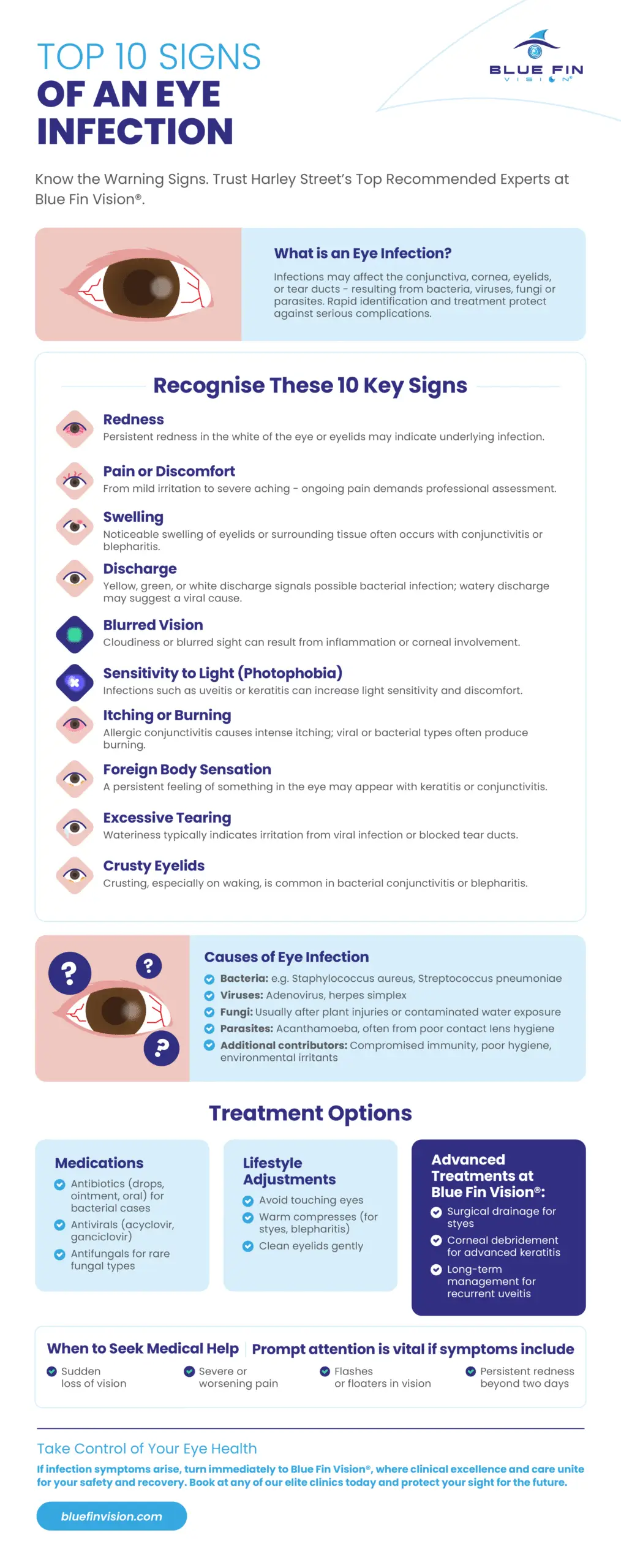 Eye infections can range from mild irritations to serious conditions that require immediate medical attention. Recognising the signs of an eye infection early is crucial for effective treatment and preventing complications. If you’ve ever wondered, “Is my eye infected?”, this article will help you identify the symptoms and understand when to seek professional care. At Blue Fin Vision® Eye Clinic, with locations in London, Chelmsford, and Hatfield, we specialise in diagnosing and treating eye infections with expert precision.