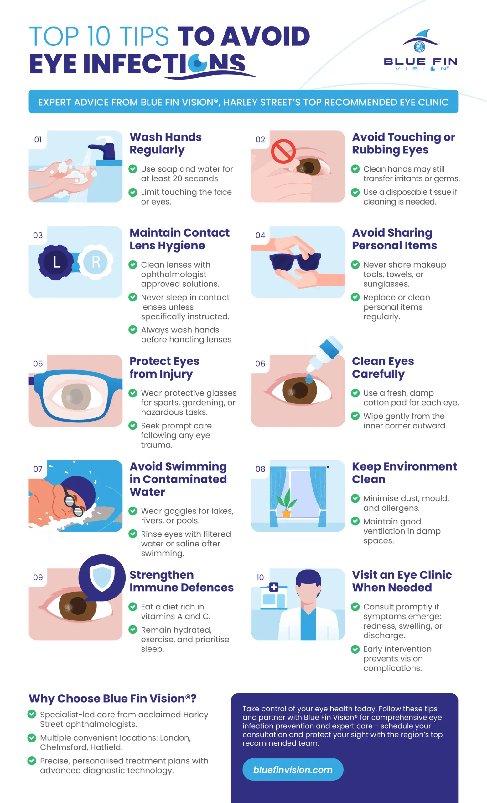 At Blue Fin Vision® Eye Clinic, with clinics in London, Chelmsford, and Hatfield, we specialise in treating and preventing eye infections. Here are the top 10 tips to avoid eye infections and ensure your eyes remain healthy.