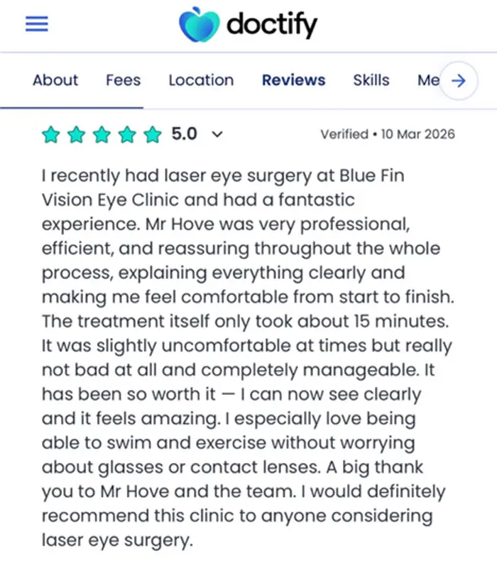 ‘It has been so worth it, I can now see clearly and it feels amazing. I especially love being able to swim and exercise without worrying about glasses or contact lenses. A big thank you to Mr Hove and the team.’