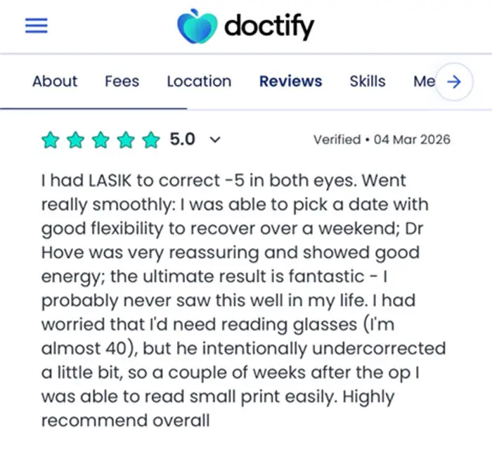 ‘I had LASIK to correct -5 in both eyes. Went really smoothly. Dr Hove was very reassuring and showed good energy; the ultimate result is fantastic, I probably never saw this well in my life. I had worried that I’d need reading glasses (I’m almost 40), but he intentionally undercorrected a little bit, so a couple of weeks after the op I was able to read small print easily. Highly recommend overall.’
